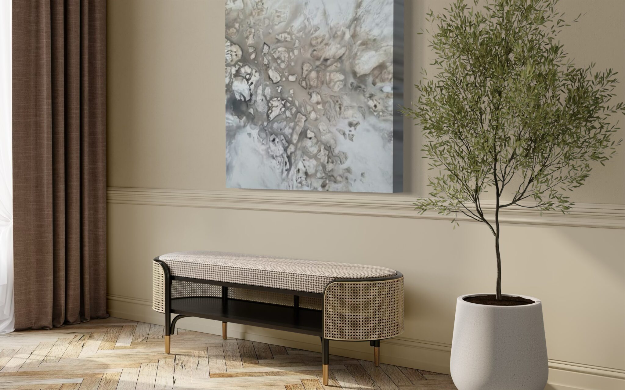Inspireret af de danske strande indkapsler værkerne essensen af bølgernes bløde spor i sandet og vandets rolige bevægelser, der elegant snor sig omkring forhindringer og skaber nye stier.